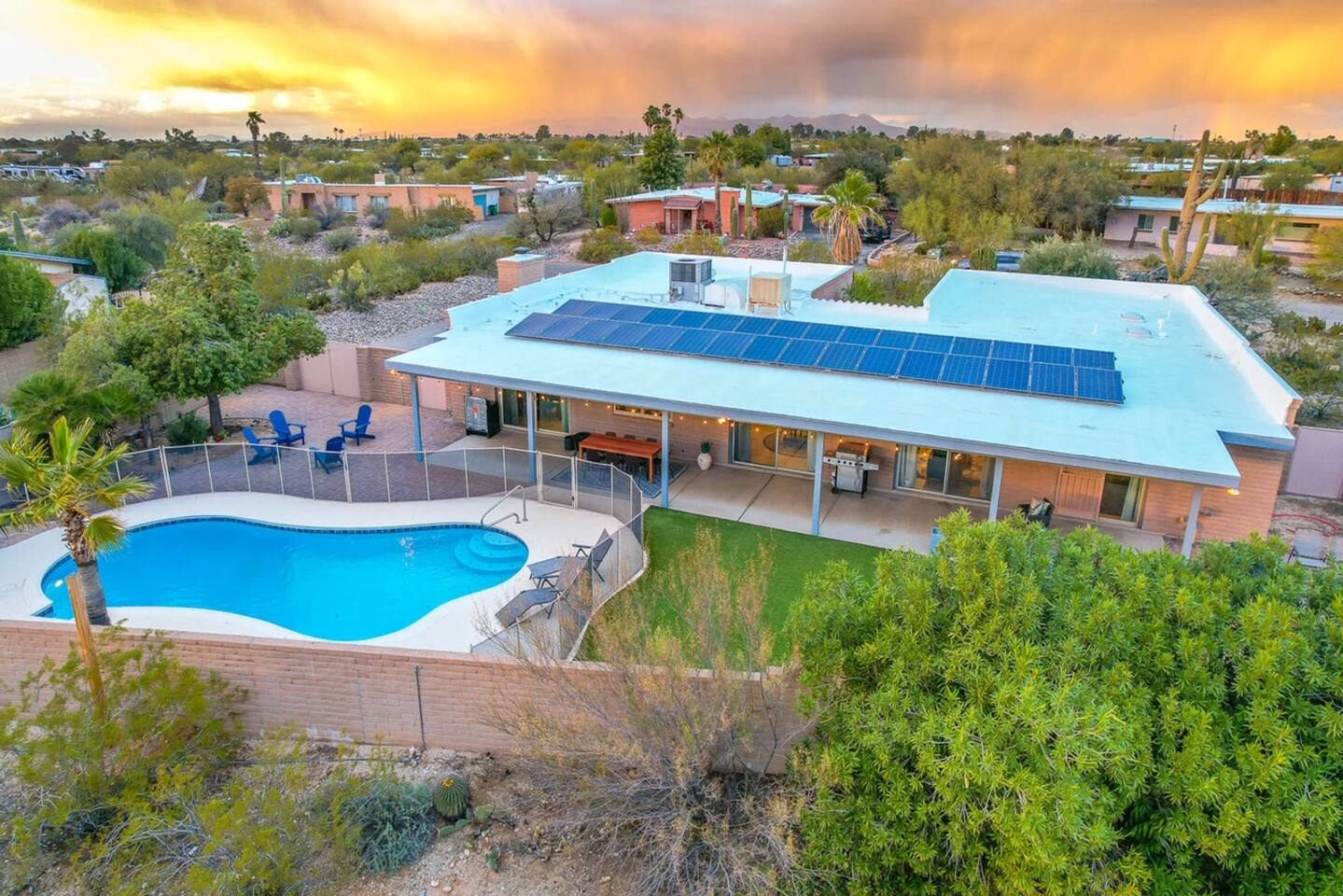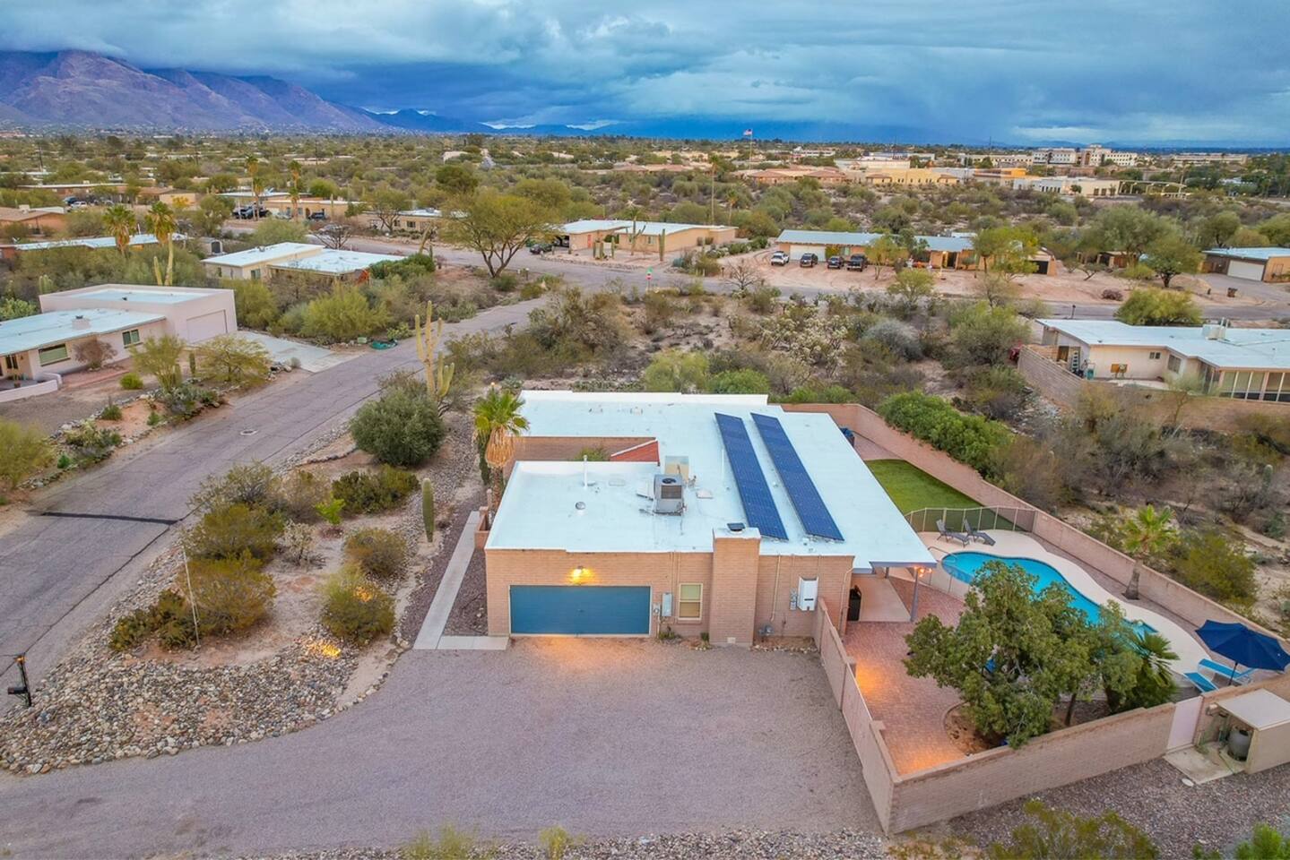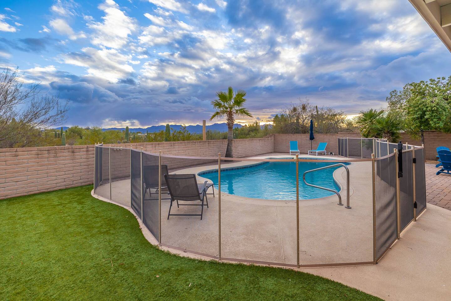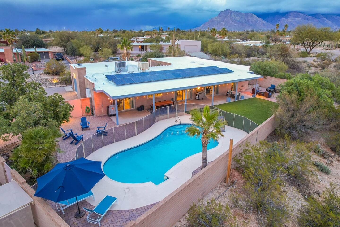 In addition to the described, there is also a powder room located between the two large living spaces near the kitchen and large laundry room. Heated pool, great views, a BBQ grill, propane fire pit make the place perfect. A desk with a computer monitor together with HDMI cable and a remote keyboard/mouse make this home an easy choice for those needing to work remotely – especially with Xfinity’s fastest WiFi available. Golf, hiking, biking and other activities are all within easy access. Whole Foods, Trader Joe’s, AJ’s and many of Tucson’s premier restaurants are nearby, as well as Tucson’s upscale Encantada Mall. This family-friendly home works well for couples, business executives, or two to three families sharing accommodations while visiting Tucson. Your rental will include: Entertainment 2TVs (65 and 40 inch) Cable TV Wireless Internet Kitchen Well appointed – dishes, silverware, utensils and cookware Toaster Coffee Maker – both carafe and single serve brewer included Glass Cooktop Electric Oven Dishwasher Blender Extra Full-size Fridge For security purposes, the property has an exterior video camera as part of a garage door keypad; field of view includes only the driveway.