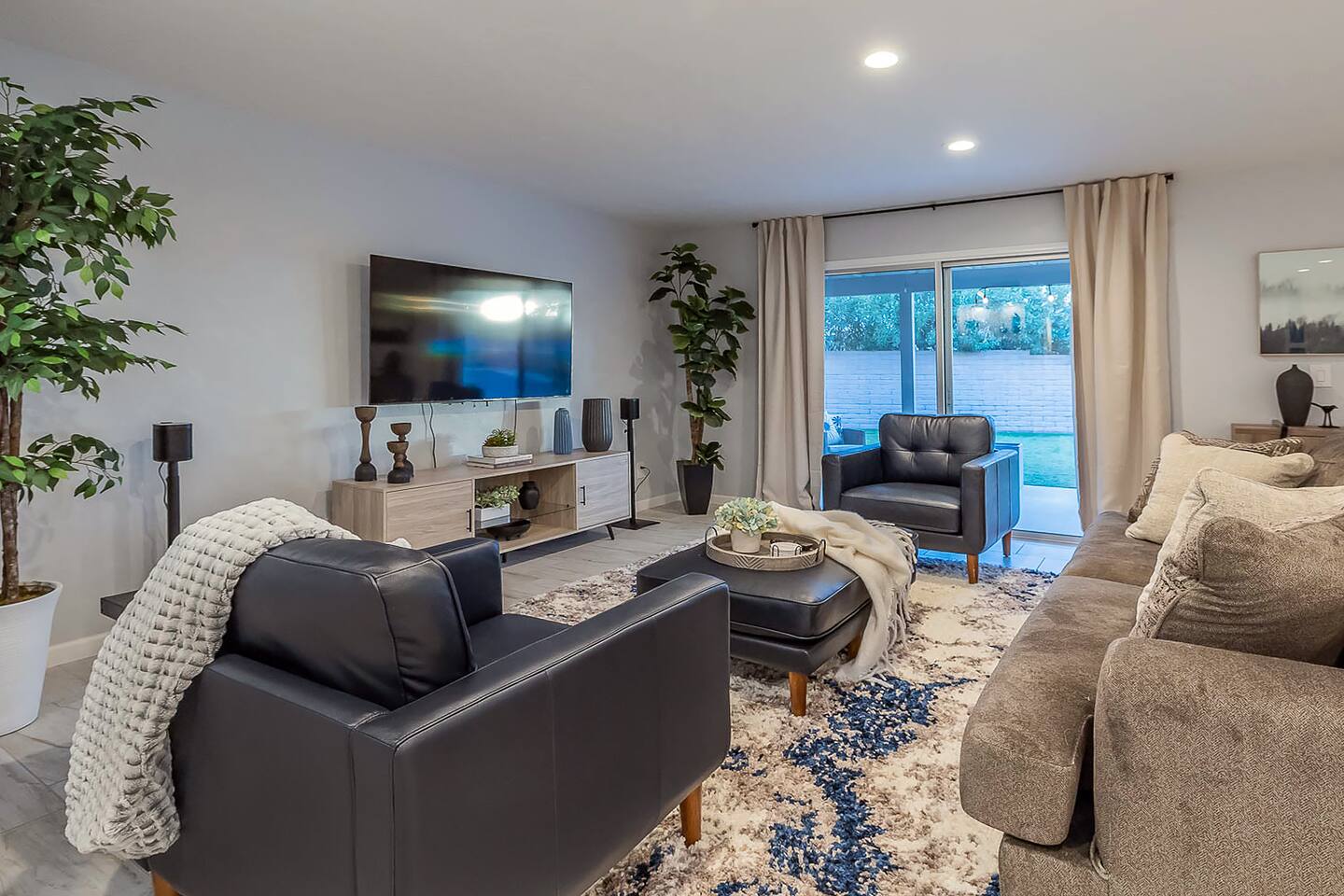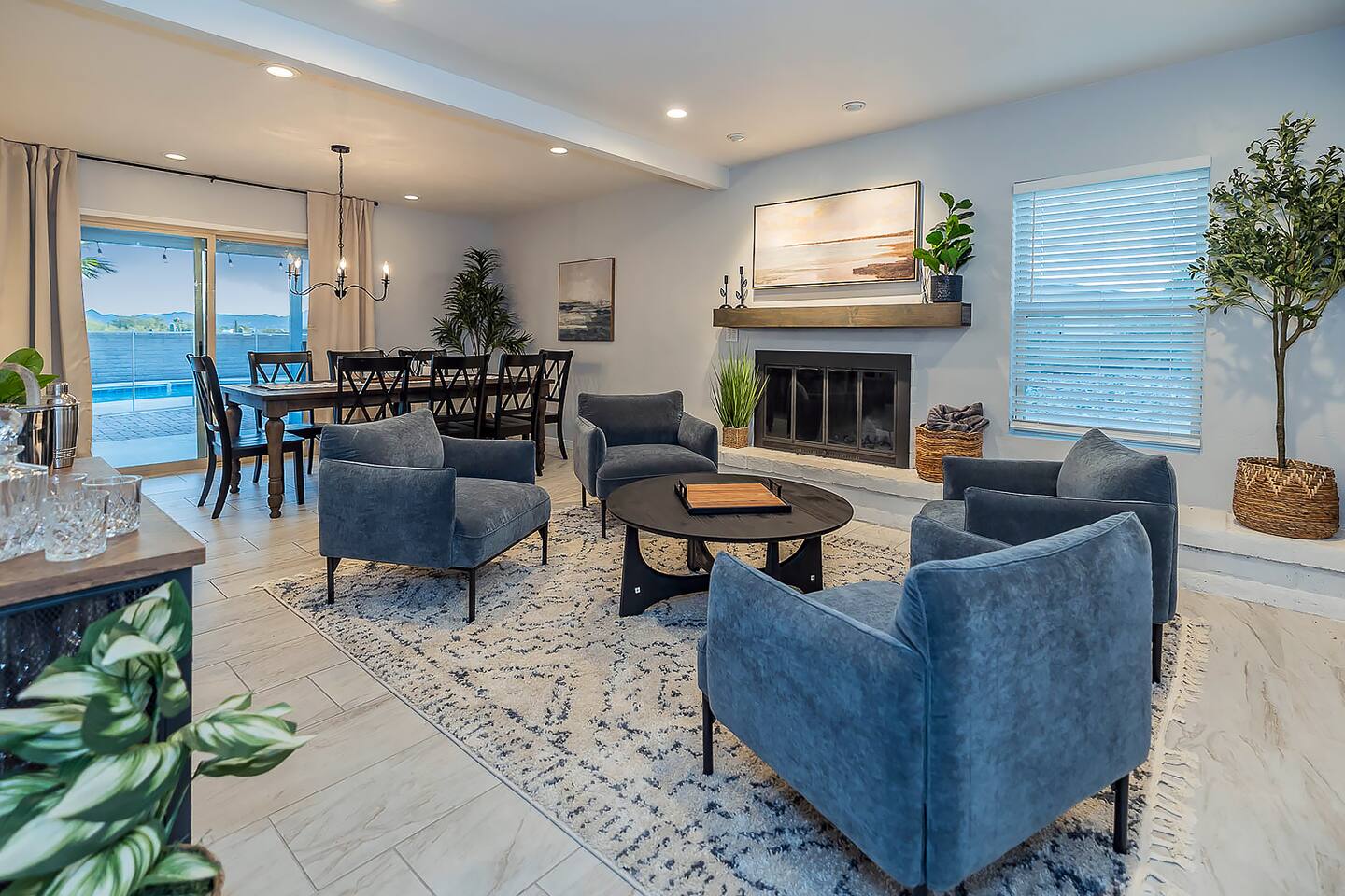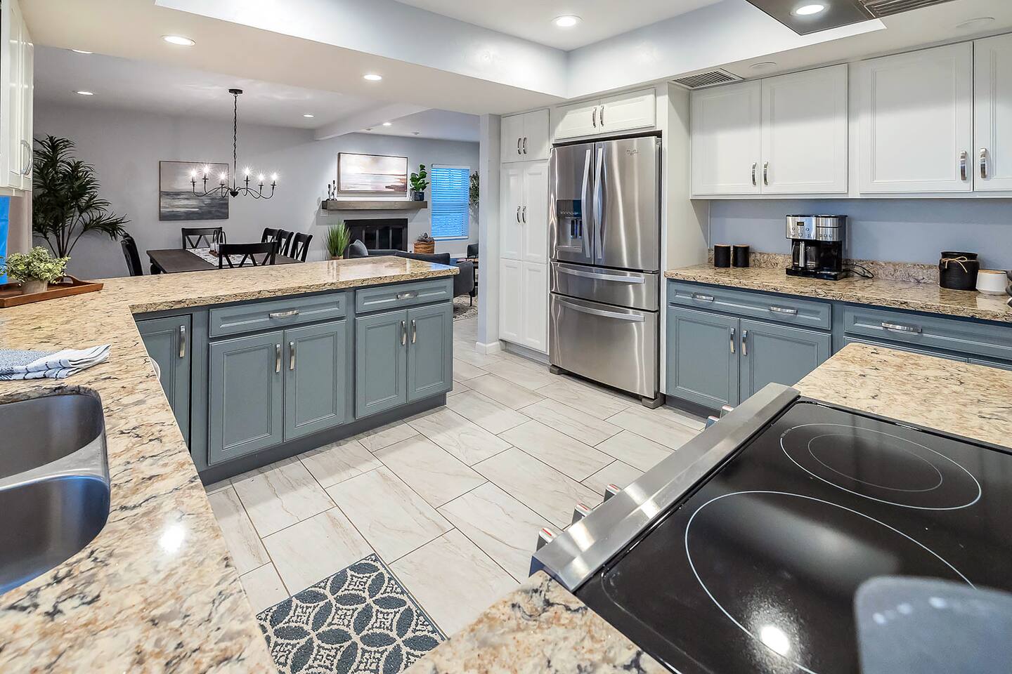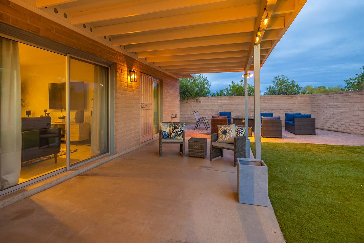 In addition to the described, there is also a powder room located between the two large living spaces near the kitchen and large laundry room. Heated pool, great views, a BBQ grill, propane fire pit make the place perfect. A desk with a computer monitor together with HDMI cable and a remote keyboard/mouse make this home an easy choice for those needing to work remotely – especially with Xfinity’s fastest WiFi available. Golf, hiking, biking and other activities are all within easy access. Whole Foods, Trader Joe’s, AJ’s and many of Tucson’s premier restaurants are nearby, as well as Tucson’s upscale Encantada Mall. This family-friendly home works well for couples, business executives, or two to three families sharing accommodations while visiting Tucson. Your rental will include: Entertainment 2TVs (65 and 40 inch) Cable TV Wireless Internet Kitchen Well appointed – dishes, silverware, utensils and cookware Toaster Coffee Maker – both carafe and single serve brewer included Glass Cooktop Electric Oven Dishwasher Blender Extra Full-size Fridge For security purposes, the property has an exterior video camera as part of a garage door keypad; field of view includes only the driveway.